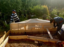 Приступаем к монтажу верха. Слишком тяжёлую крышу на руках поднять и закрепить оказалось невозможно, для этого пригнали кран, с помощью которого установка верха была завершена.